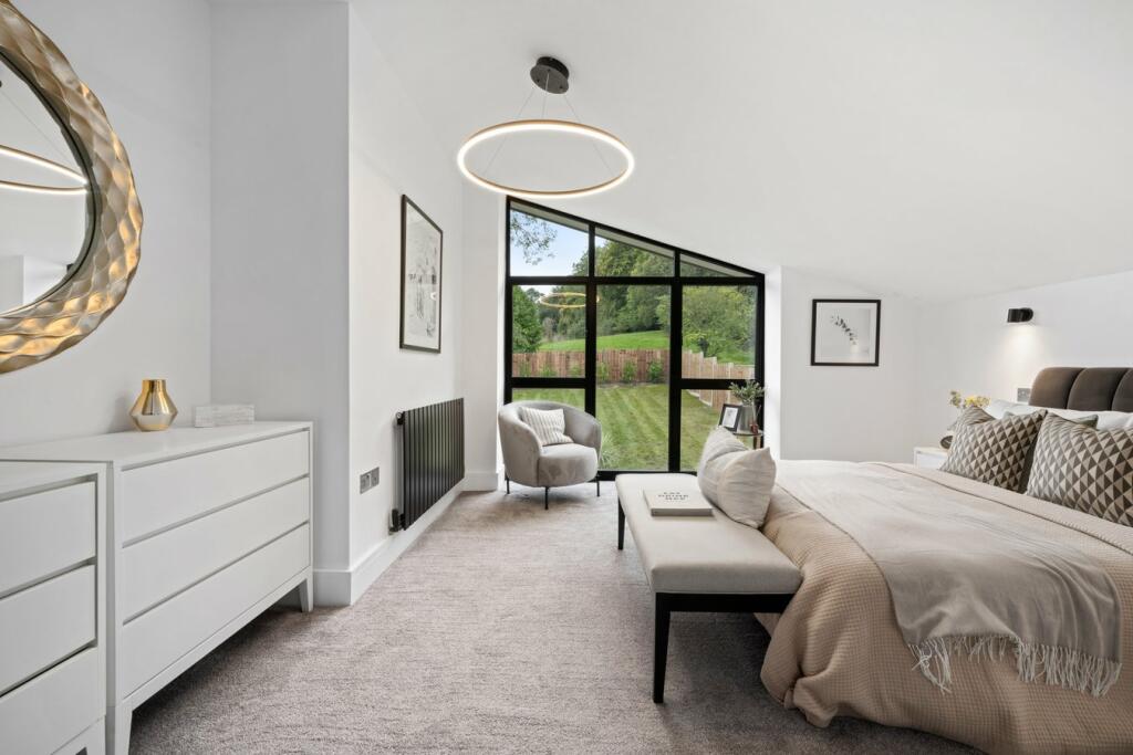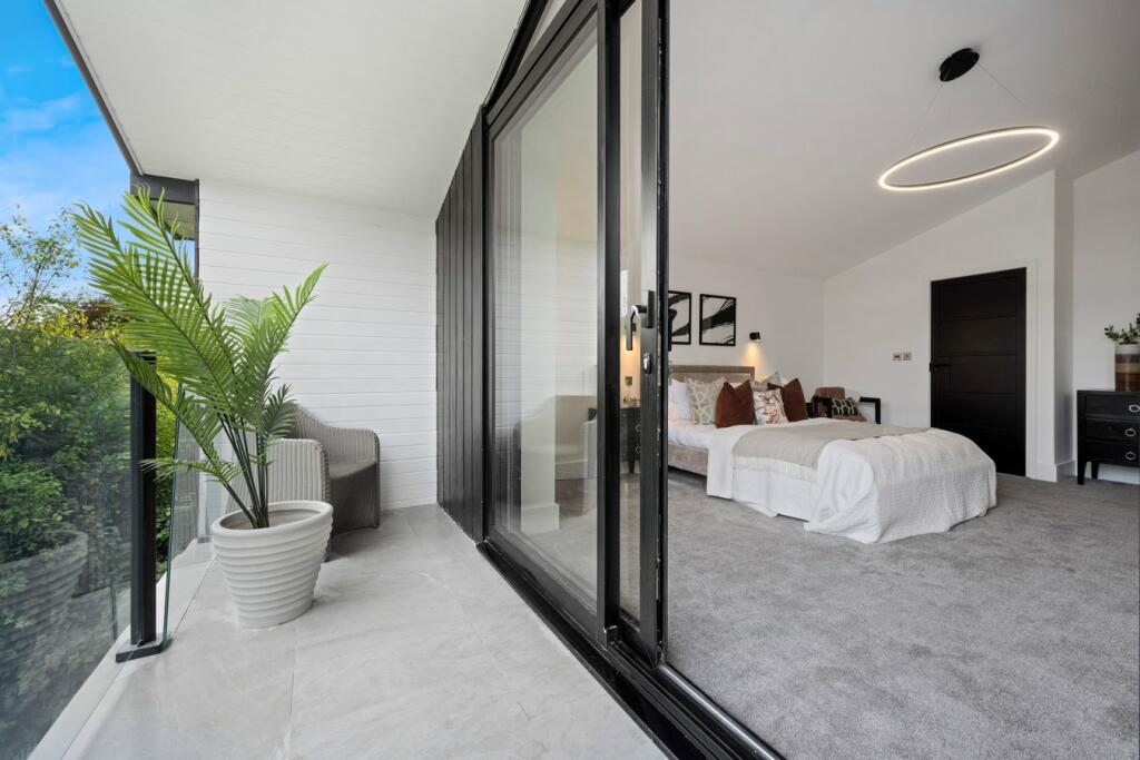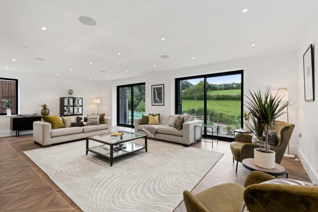 Set nicely on the plot, a granite sett driveway leads you to the front entrance with a floor-to-ceiling gallery front door with panes of glass to either side to flood the entrance hall with natural light. To the right of the entrance you will step into the ‘heart of the home’ where an opulent open plan kitchen/dining space welcomes your family and friends with a stunning island to gather round the high-end Pearcroft fitted kitchen. The kitchen and dining area is impeccably crafted and adorned with hand-picked elegant Italian porcelain tiles. To the left of the entrance hall, steps lead to the spacious lounge with large sliding doors to the front of the property.
