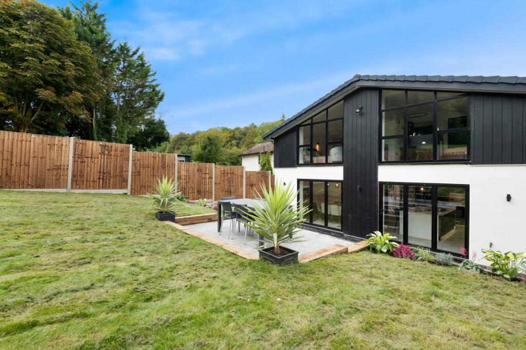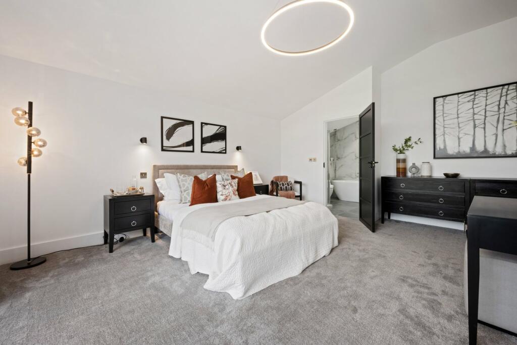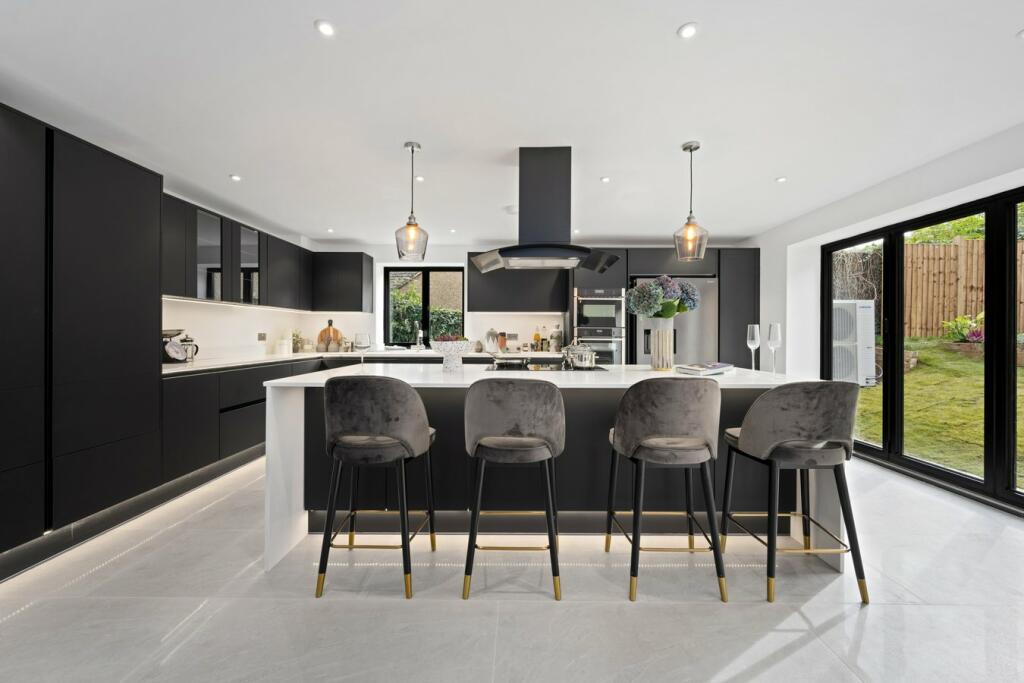 Set nicely on the plot, a granite sett driveway leads you to the front entrance with a floor-to-ceiling gallery front door with panes of glass to either side to flood the entrance hall with natural light. To the right of the entrance you will step into the ‘heart of the home’ where an opulent open plan kitchen/dining space welcomes your family and friends with a stunning island to gather round the high-end Pearcroft fitted kitchen. The kitchen and dining area is impeccably crafted and adorned with hand-picked elegant Italian porcelain tiles. To the left of the entrance hall, steps lead to the spacious lounge with large sliding doors to the front of the property.